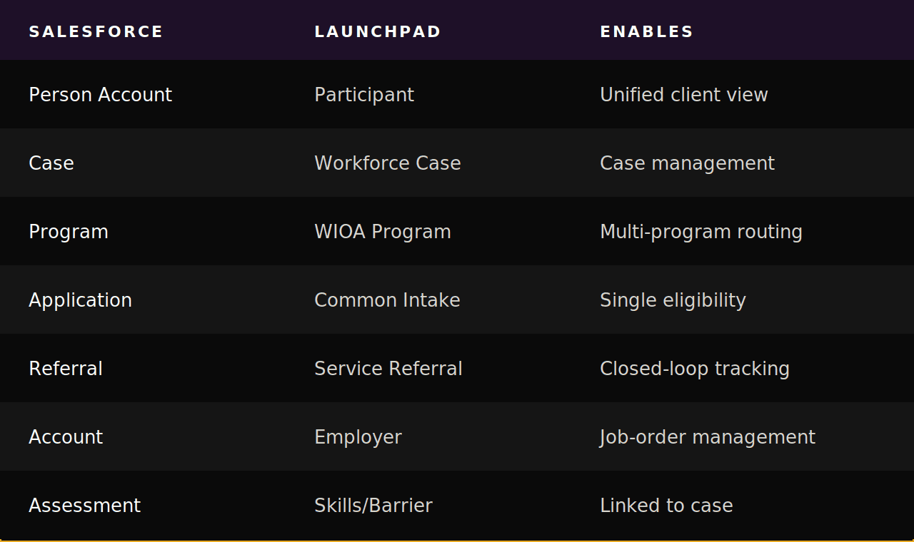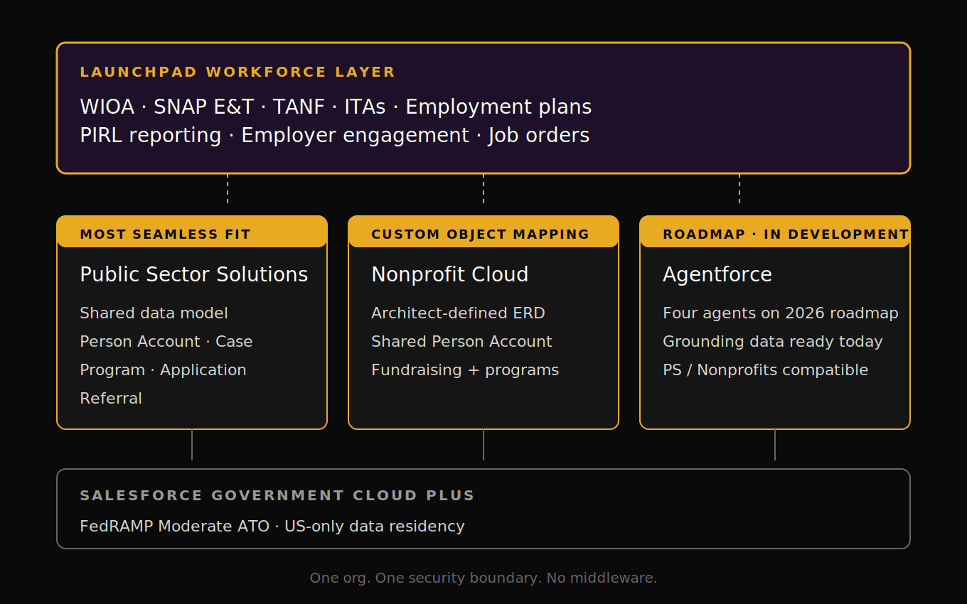 Launchpad is a Salesforce-native ISV application running on Government Cloud Plus. One org. One audit trail.